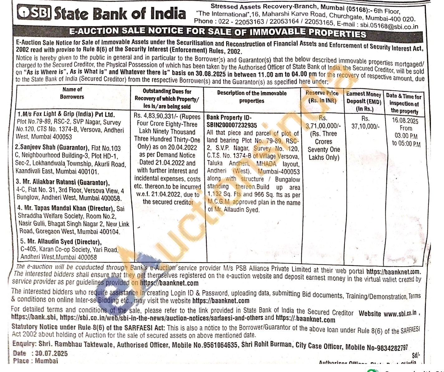 All that piece and parcel of plot of land bearing Plot No. 79-89, RSC-2. S.V.P. Nagar, Survey No. 120. C.T.S. No. 1374-B of Village Versova, Taluka Andheri, MHADA layout, Andheri (West), Mumbai-400053 along with structure Bungalow standing thereon.Build up area 1,132 Sq. Fts and 966 Sq. fts as per M.C.G.M approved plan in the name of Mr. Allaudin Syed