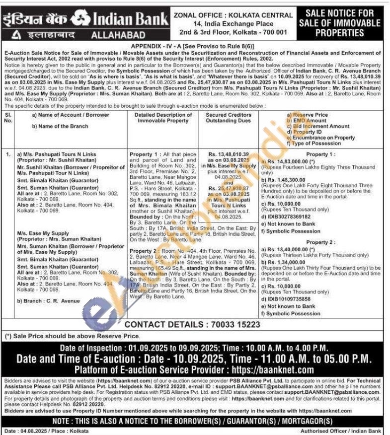 Room No. 404, 4th Floor, Premsies No. 2. Baretto Lane, Near 4 Mangoe Lane, Ward No. 46, Lalbazar, P.S. Hare Street, Kolikata 700 069, measuring 165.49 Sq.ft.