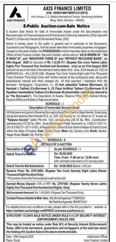 All that piece and parcel of bearing Non-agricultural Plot of land in Moje Rander, Surat lying being land bearing Ward Rander R.S. no. 228, City Survey no. 12, Sheet no. 17, known as "Kalpana Society" paikki Plot No. 10/2, admeasuring 236.78 Sq. Mtrs., Construction admeasuring 370.36 Sq. Mtrs., Surat Mahanagar Palika Tenement no. 0160-21-0211-0-001&0160-21-0211-0-002, at Registration, District & Sub-District Adajan & District Surat within the State of Gujarat.