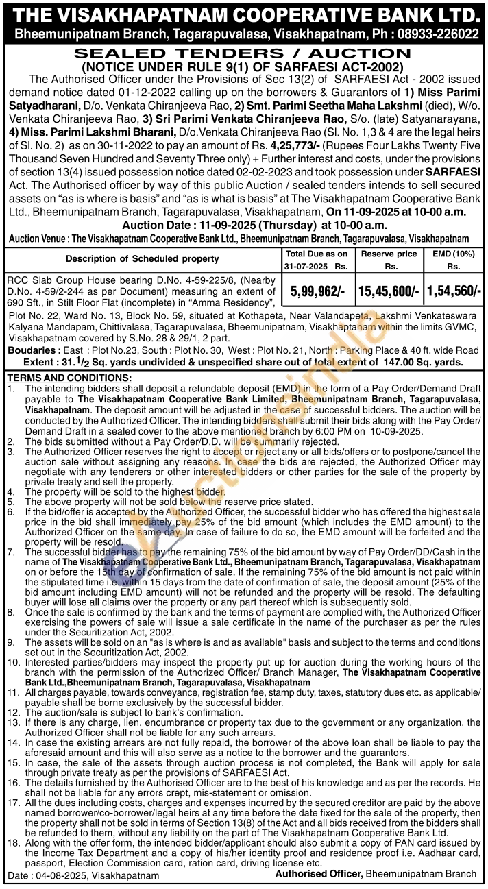RCC Slab Group House bearing D.No. 4-59-225/8, (Nearby D.No. 4-59/2-244 as per Document) measuring an extent of 690 Sft., in Stilt Floor Flat (incomplete) in "Amma Residency", Plot No. 22, Ward No. 13, Block No. 59, situated at Kothapeta, Near Valandapeta, Lakshmi Venkateswara Kalyana Mandapam, Chittivalasa, Tagarapuvalasa, Bheemunipatnam, Visakhaptanam within the limits GVMC, Visakhapatnam covered by S.No. 28 & 29/1, 2 part. Boudaries: East: Plot No.23, South: Plot No. 30, West: Plot No. 21, North: Parking Place & 40 ft. wide Road Extent: 31.1/2 Sq. yards undivided & unspecified share out of total extent of 147.00 Sq. yards.