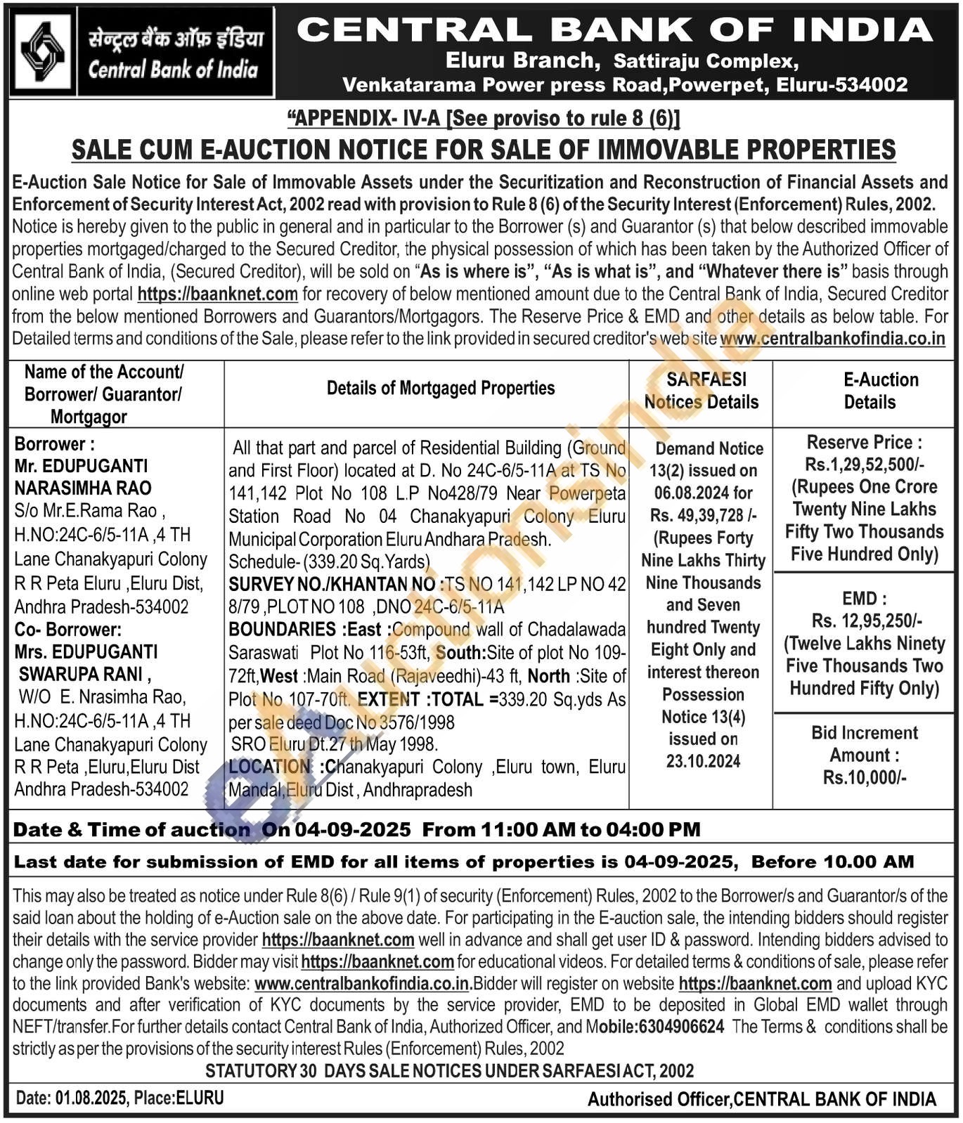 All that part and parcel of Residential Building (Ground and First Floor) located at D. No 24C-6/5-11A at TS No 141,142 Plot No 108 L.P No428/79 Near Powerpeta Station Road No 04 Chanakyapuri Colony Eluru Municipal Corporation Eluru Andhara Pradesh. Schedule- (339.20 Sq. Yards) SURVEY NO./KHANTAN NO:TS NO 141,142 LP NO 42 8/79, PLOT NO 108,DNO 24C-6/5-11A BOUNDARIES: East: Compound wall of Chadalawada Saraswati Plot No 116-53ft, South: Site of plot No 109-72ft, West :Main Road (Rajaveedhi)-43 ft, North: Site of Plot No 107-70ft. EXTENT: TOTAL =339.20 Sq.yds As per sale deed Doc No 3576/1998 SRO Eluru Dt.27 th May 1998. LOCATION : Chanakyapuri Colony, Eluru town, Eluru Mandal, Eluru Dist, Andhrapradesh