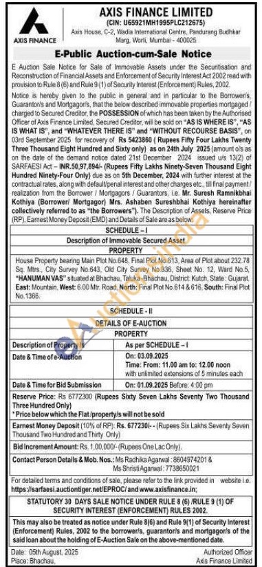 House Property bearing Main Plot No.648, Final Plot No.613, Area of Plot about 232.78 Sq. Mers., City Survey No.643, Old City Survey No.836, Sheet No. 12, Ward No.5, "HANUMAN VAS" situated at Bhachau, Taluka-Bhachau, District Kutch, State: Gujarat, East: Mountain, West: 6.00 Mtr. Road, North; Final Plot No.614 & 616, South: Final Plot No. 1366