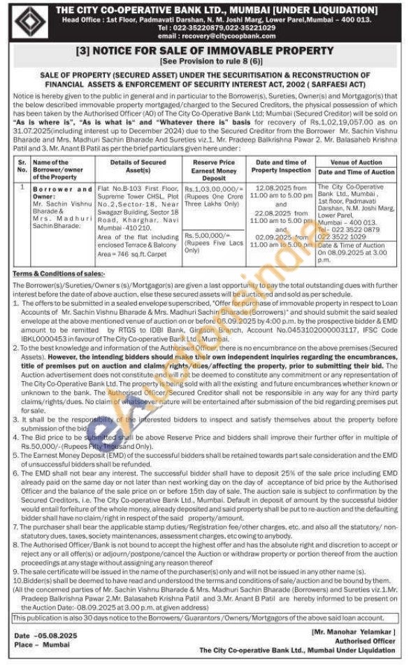 Flat No.B-103 First Floor, Supreme Tower CHSL, Plot No.2,Sector-18, Near Swagazz Building, Sector 18 Road, Kharghar, Navi Mumbai-410210. Area of the flat including enclosed Terrace & Balcony Area-746 sq.ft. Carpet