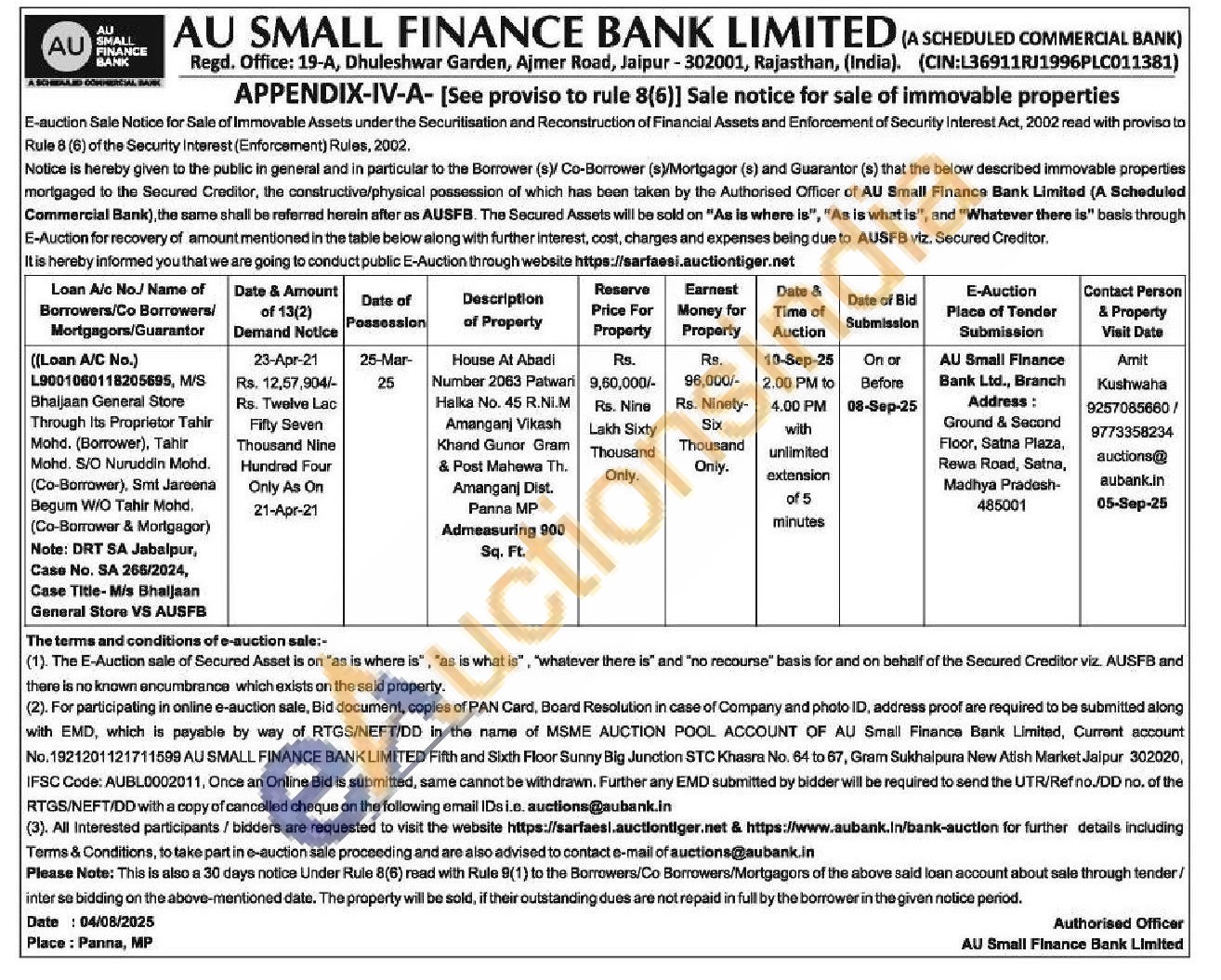 House At Abadi Number 2063 Patwari Halka No. 45 R.NLM Amanganj Vikash Khand Gunor Gram & Post Mahewa Th. Amanganj Dist. Panna MP Admeasuring 900 Sq. Ft.