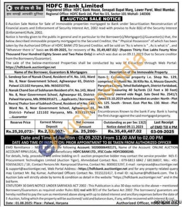 Item-1: Commercial property i.e. Shop No. 129, comprised in Mustil No. 36 Killa No. 6, Mouza Gaunchi, Parvatiya Colony, Tehsil Ballabhgarh, District Faridabad, Haryana measuring 40 Sq. Yards (12 Feet x 30 Feet) purchased/owned vide Regd. Sale Deed No. 2541/1 dated 23.10.2019 which bounded as under: North-Plot No. 125. South Street. East- Plot No. 130. West-Plot No. 128. Encumbrances Known to the bank if any. Bank is having the first charge against the said mortgaged property.