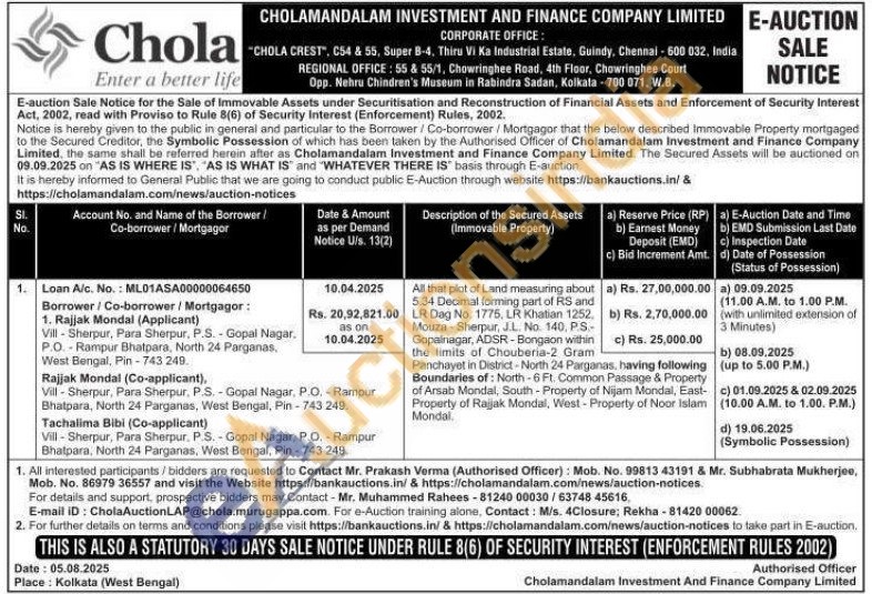Contact Mr. Prakash Verma (Authorised Officer): Mobile No : 9981343191 / Mr. Subhabrata Mukherjee Mobile No : 8697936557
