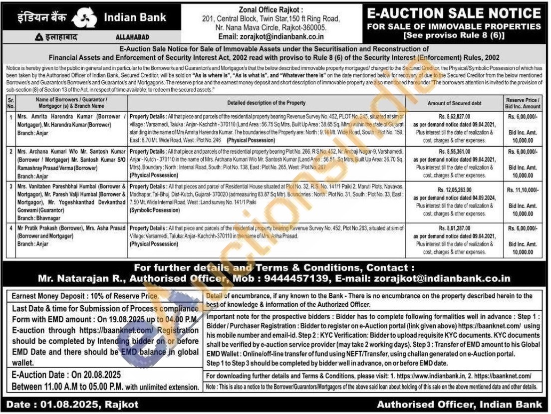 Property Details: All that pieces and parcel of Residential House situated at Plot No. 32, R.S. No. 141/1 Paiki 2, Maruti Plots, Navavas, Madhapar, Tal-Bhuj, Dist-Kutch, Gujarat-370020 (admeasuring 83.87 Sq Mtr). Boundaries: North: Plot No. 31, South: Plot No. 33, East: 7.50 Mt. Wide Internal Road, West: Land survey No. 141/1 Paiki