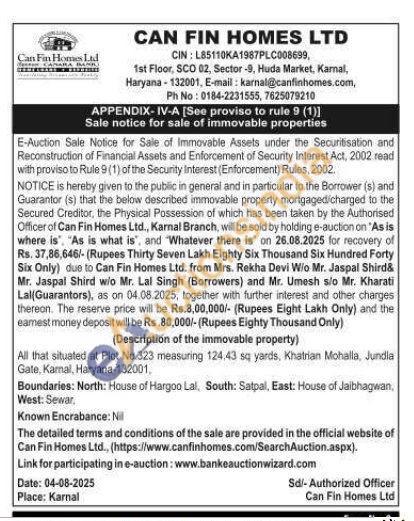 All that situated at Plot No.323 measuring 124.43 sq yards, Khatrnan Mohalla, Jundla Gate, Karnal, Haryana-132001, Boundaries: North: House of Hargoo Lal, South: Satpal, East: House of Jaibhagwan, West: Sewar, Known Encrabance: Nil