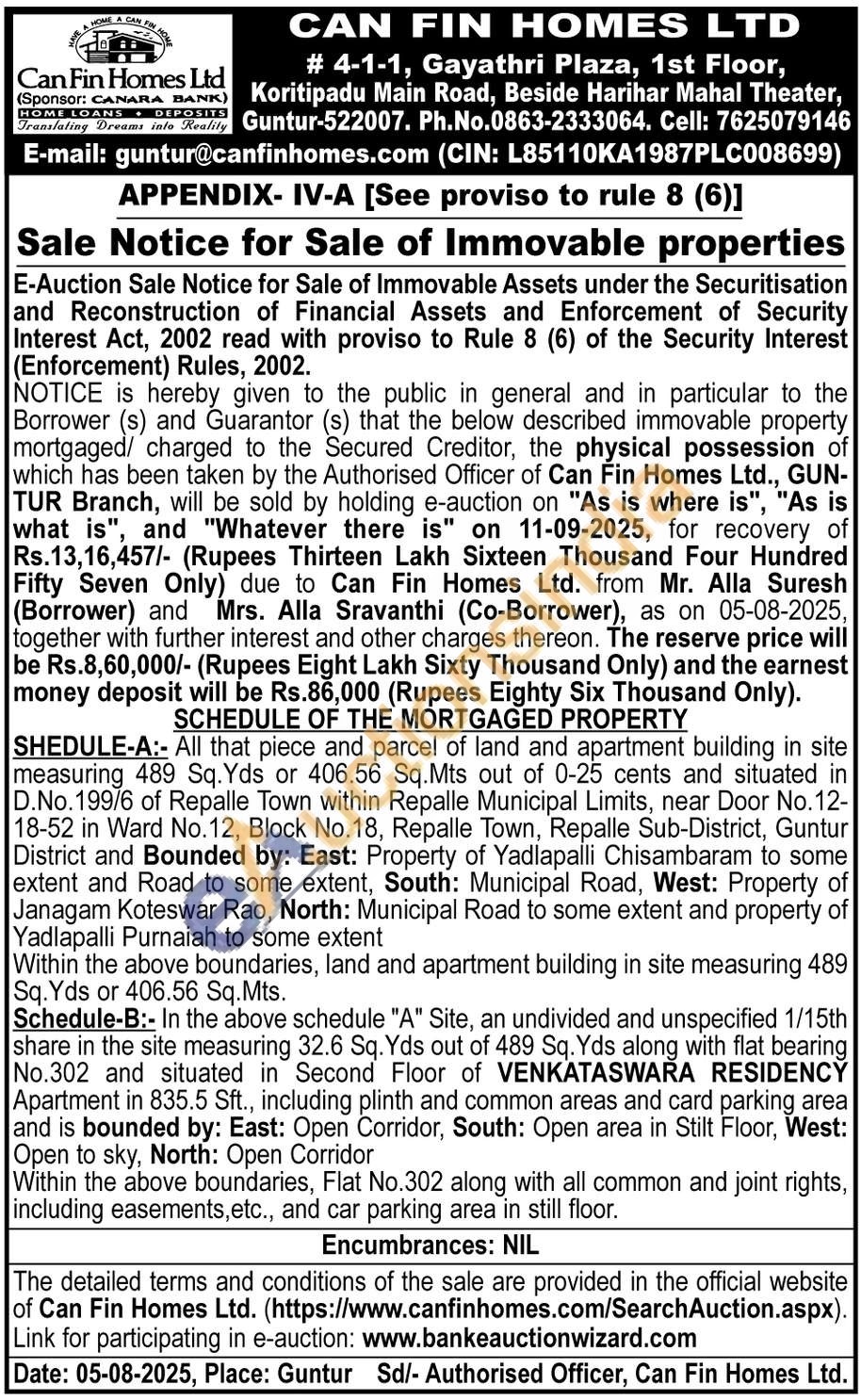 SHEDULE-A:- All that piece and parcel of land and apartment building in site measuring 489 Sq. Yds or 406.56 Sq.Mts out of 0-25 cents and situated in D.No. 199/6 of Repalle Town within Repalle Municipal Limits, near Door No.12-18-52 in Ward No.12, Block No.18, Repalle Town, Repalle Sub-District, Guntur District and Bounded by: East: Property of Yadlapalli Chisambaram to some extent and Road to some extent, South: Municipal Road, West: Property of Janagam Koteswar Rao, North: Municipal Road to some extent and property of Yadlapalli Purnaiah to some extent Within the above boundaries, land and apartment building in site measuring 489 Sq. Yds or 406.56 Sq.Mts. Schedule-B:- In the above schedule "A" Site, an undivided and unspecified 1/15th share in the site measuring 32.6 Sq. Yds out of 489 Sq. Yds along with flat bearing No.302 and situated in Second Floor of VENKATASWARA RESIDENCY Apartment in 835.5 Sft., including plinth and common areas and card parking area and is bounded by: East: Open Corridor, South: Open area in Stilt Floor, West: Open to sky, North: Open Corridor Within the above boundaries, Flat No.302 along with all common and joint rights, including easements, etc., and car parking area in still floor