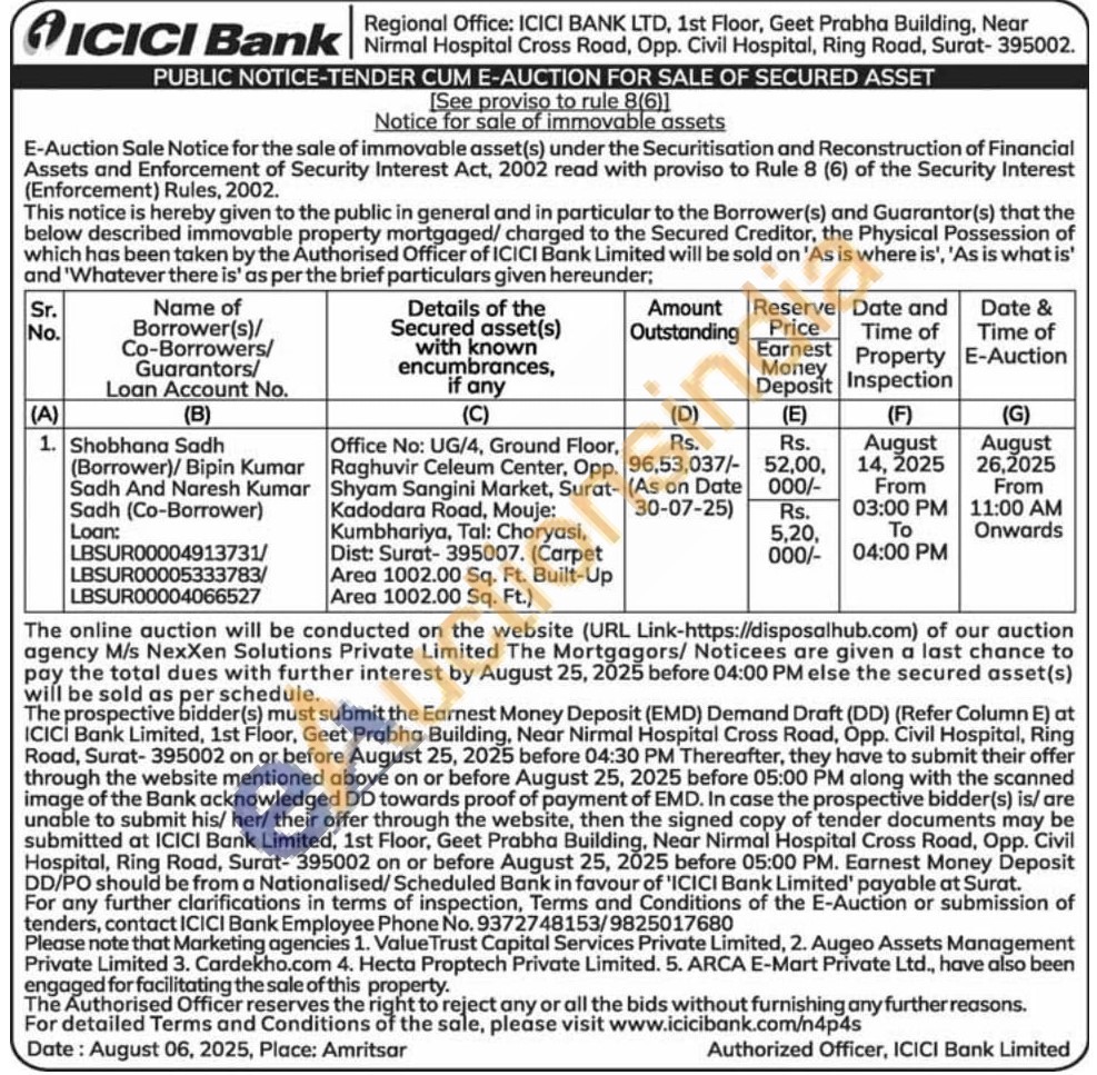 Office No: UG/4, Ground Floor, Raghuvir Celeum Center, Opp. Shyam Sangini Market, Surat-Kadodara Road, Mouje: Kumbhariya, Tal: Choryasi, Dist: Surat-395007. (Carpet Area 1002.00 Sq. Ft. Built-Up Area 1002.00 Sq. Ft.)