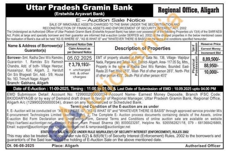 EMT of property situated at Part of Gata No. 136. Village- Wajidpur Nada, Pargana and Tehsil-Koil, District-Aligarh, Area- 117.05 Sq. Mirs, Property in the name of Radha Devi Wio Ramdev, Bounded: East-Rasta 20 Feet Wide 28'0", West- Plot of other person 28'0", North- Plot of other person 45'0", South- Plot of other person 45'0"