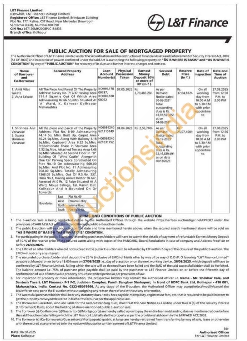 All the piece and parcel of the Property Address: Flat No. 8-09 Admeasuring 44.14 54. Mtrs. Built Up, Carpet Area 40.24 50.Mtrs. Along With Balcony 4.18 Sq.Mtrs, Cupboard Ares 6.22 5q.Mts, Proportionate Share in Staircase Area 7.525q.Mtrs, Attached Terrace Area 4.46 Sq.Mtrs Situated At Second Floor in "" Building Of "Wind Castle Alongwith One Car Parking Space Constructed On Plot No.10 On Admeasuring 660.00 Sq.Mtrs. And Plot No. 11 Admeasuring 708.00 Sq.Mers. Totally Admeasuring 1368.00 Sq.Mtrs. Out Of RS.No. 237. Hissa No Having Area 0 Hector 18 Aar, Assested At 0 Rs. 12 Paise Situated At A Ward, Mouje Balinga, Tal. Karvir, Dist. Kolhapur And is Bounded On Or Towards Boundaries
