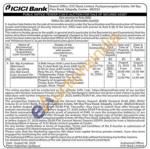 4 BHK House With Land Area 64904 Sq. Ft. And Built-Up Area 2400 Sq. Ft In 60.32 Ares (149 Cents) Sy No.1/1 Resy No.1/1. Payavur Village. Thaliparambu Taluk, Kannur District 670633. Bounded On The North Property of Angamaly Mary South: Thodu, East Property of Karimakkil Joseph. West: Thodu