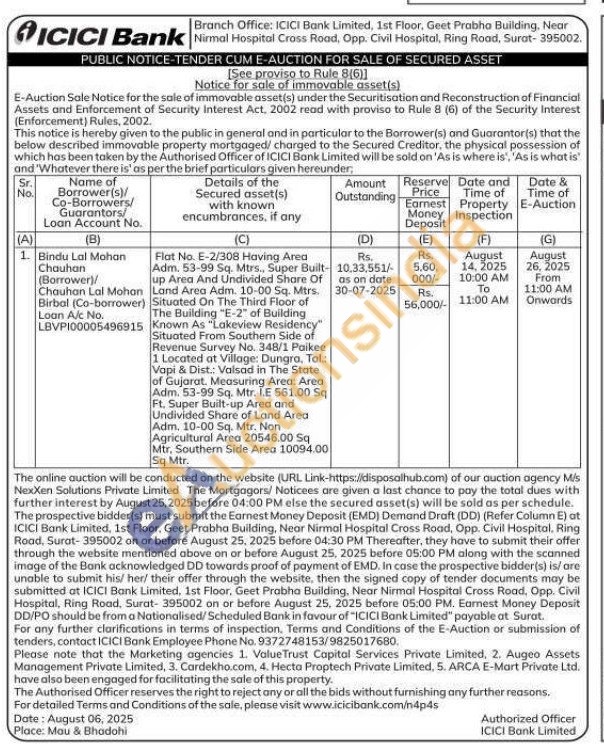 Flat No. E-2/308 Having Area Adm. 53-99 Sq. Mtrs., Super Built-up Area And Undivided Share Of Land Area Adm. 10-00 Sq. Mtrs. Situated On The Third Floor of The Building "E-2" of Building Known As "Lakeview Residency" Situated From Southern Side of Revenue Survey No. 348/1 Paikee 1 Located at Village: Dungra, Tal.: Vapi & Dist.: Valsad in The State of Gujarat. Measuring Area: Area Adm. 53-99 Sq. Mtr. I.E 561.00 Sq Ft. Super Built-up Area and Undivided Share of Land Area Adm. 10-00 Sq. Mtr. Non Agricultural Area 20546.00 Sq Mtr, Southern Side Area 10094.00 Sq Mtr.