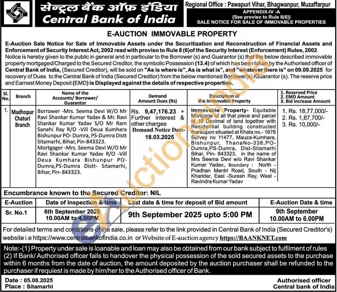 Equitable Mortgage of all that piece and parcel of 10 Decimal of land together with Residential building constructed thereupon situated at Khata no.- 1676 Survey no 11477, Mauza-Kumhara, Bishunpur, ThanaNo-338,PO-Dumra, PS-Dumra, Dist-Sitamarhi Bihar, Pin-843323, in the name of Mrs Seema Devi w/o Ravi Shankar Kumar Yadav., Boundary: North-Pradhan Mantri Road, South - Nij Kharidar, East -Suresh Ray, West Ravindra Kumar Yadav