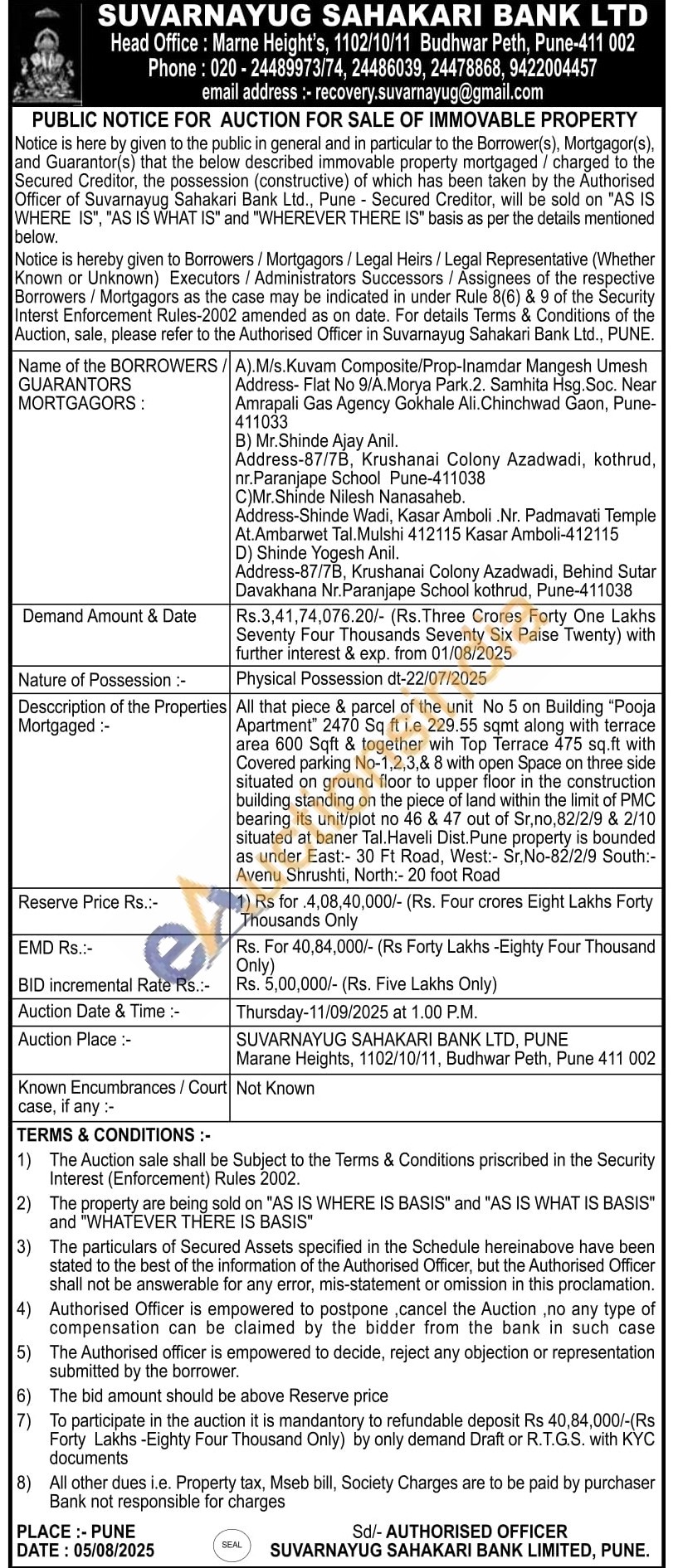 All that piece & parcel of the unit No 5 on Building "Pooja Apartment" 2470 Sq ft i.e 229.55 sqmt along with terrace area 600 Sqft & together wih Top Terrace 475 sq.ft with Covered parking No-1,2,3,& 8 with open Space on three side situated on ground floor to upper floor in the construction building standing on the piece of land within the limit of PMC bearing its unit/plot no 46 & 47 out of Sr, no, 82/2/9 & 2/10 situated at baner Tal. Haveli Dist. Pune property is bounded as under East:- 30 Ft Road, West:- Sr, No-82/2/9 South:-Avenu Shrushti, North:- 20 foot Road