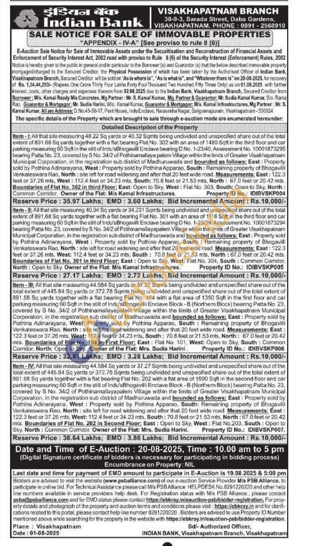 Item-II: All that site measuning 40.94 Sq yards or 34.231 Sqmts being undivided and unspecified share out of the total extent of 891.68 Sq yards together with a flat bearing Flat No. 301 with an area of 1118 Sqft in the third floor and car parking measuring 60 Sqft in the stilt of Indu's Bhogavilli Enclave bearing D No. 1-23/39, Assessment No. 10001873294 bearing Patta No. 23, covered by S No. 34/2 of Pothinamallayapalem Village within the limits of Greater Visakhapatnam Municipal Corporation, in the registration sub district of Madhuruwada and bounded as follows: East: Property sold by Pothina Adinarayana, West: Property sold by Pothina Apparao, South: Remaining property of Bhogavilli Venkateswara Rao, North: site left for road widening and after that 20 feet wide road. Measurements: East: 122.3 feet or 37.26 mts, West: 112.4 feet or 34.23 mts, South: 70.8 feet or 21.53 mts. North: 67.0 feet or 20.42 mts. Boundaries of Flat No. 301 in third Floor: East: Open to Sky, West: Flat No. 304, South: Common Corridor, North: Open to Sky. Owner of the Flat: M/s Kamal Infrastructures