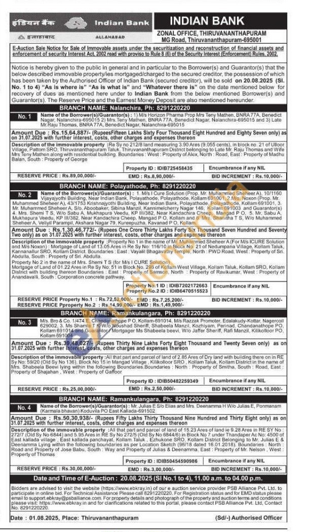Description of the immovable property :Re Sy no 212/8 land measuring 3.90 Ares (9.055 cents), in block no. 21 of Ulloor Village, Pattom SRO, Thiruvananthapuram Taluk. Thiruvananthapuram District belonging to Late Mr. Raju Thomas and Wife Mrs Tony Mathen along with residential building Boundaries: West: Property of Alex, North Road, East: Property of Madhu Balan, South: Property of George
