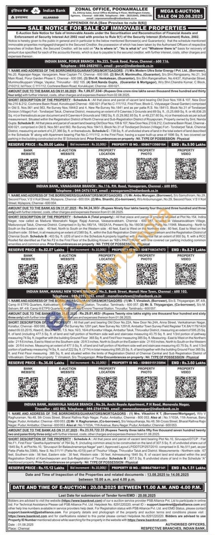 No.210 & 212, Cochrane Basin Road, Korukkupet Chennai-600021 (Flat No.C-111/112, First Floor, Block C, Vidyasagar Oswal Garden) comprised in Old S. Nos.561 and 563, Re-Survey Nos. 1844/2 and 4, New Re-Survey No. 1841 and as per patta R.S. No.1841/3, Block No.31 of Tondiarpet Division (Village) Fort-Tondiarpet Taluk, Chennai District, measuring an extent of 9 Cawnies 3 Grounds and 69 Sq. ft. (5,25.669 Sq. ft. or 48,836.25 Sq. m) or thereabouts as per document and 9 Cawnies 4 Grounds and 1982 Sq. ft. (5,29,982.65 Sq. ft. or 49,237.60 Sq. m) or thereabouts as per actual measurement. Situated within the Registration District of North Chennai and Sub-Registration District of Royapuram. Property owned by Smt. Nanda Gupta. Schedule 8: All that piece and parcel of vacant land bearing Old Door Nos. 106 & 107, New Door Nos. 210 & 212, Cochrane Basin Road, Chennai-600 021, comprised in Old S. Nos.561 and 563, Re-Survey Nos. 1841/3, Block No.31 of Tondiarpet Division (Village) Fort-Tondiarpet Taluk, Chennal District, measuring an extent of 4,27,366 Sq. ft. or thereabouts. Schedule C: 738 Sq. ft. of undivided share of land in the total extent of land described in the Schedule 'B' along with Apartment bearing Flat No.C-111/112, in the First Floor, having a super built-up area of 1696 Sq. ft. two covered car parking in the building constructed on the 'B' Schedule land. Prior Encumbrances on property: NII. TYPE OF POSSESSION: Physical