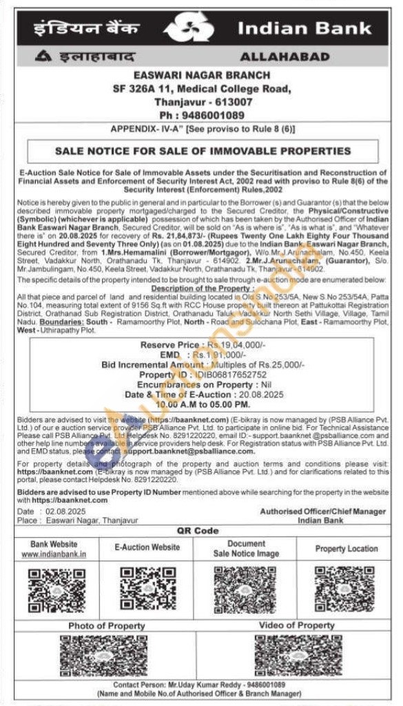 All that piece and parcel of land and residential building located in Old S. No 253/5A, New S No 253/54A, Patta No. 104, measuring total extent of 9156 Sq.ft with RCC House property built thereon at Pattukottai Registration District, Orathanad Sub Registration District, Orathanadu Taluk, Vadakkur North Sethi Village, Village, Tamil Nadu. Boundaries: South Ramamoorthy Plot, North-Road and Sulochana Plot, East-Ramamoorthy Plot, West Uthirapathy Plot