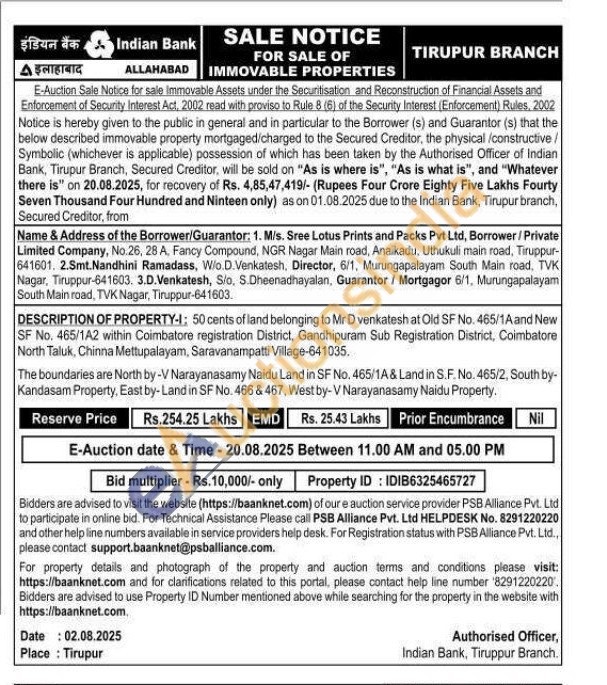 DESCRIPTION OF PROPERTY-1; 50 cents of land belonging to Mr D venkatesh at Old SF No. 465/1A and New SF No. 465/1A2 within Coimbatore registration District, Gandhipuram Sub Registration District, Coimbatore North Taluk, Chinna Mettupalayam, Saravanampatti Village-641035.