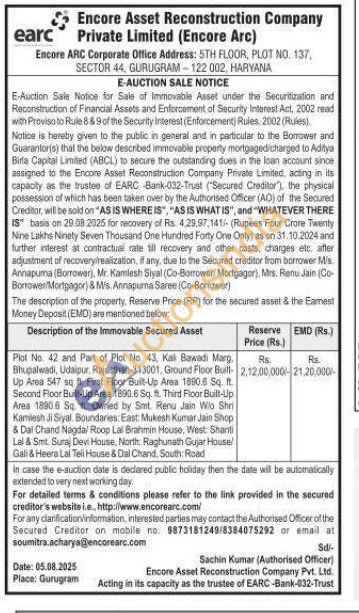 Plot No. 42 and Part of Plot No. 43, Kal Bawadi Marg, Bhupalwadi, Udaipur, Rajasthan-313001, Ground Floor Buill-Up Area 547 sq ft. First Floor Built-Up Area 1890.6 Sq. ft. Second Floor Built-Up Area 1890.6 Sq. ft. Third Floor Built-Up Area 1890.6 Sq. ft.
