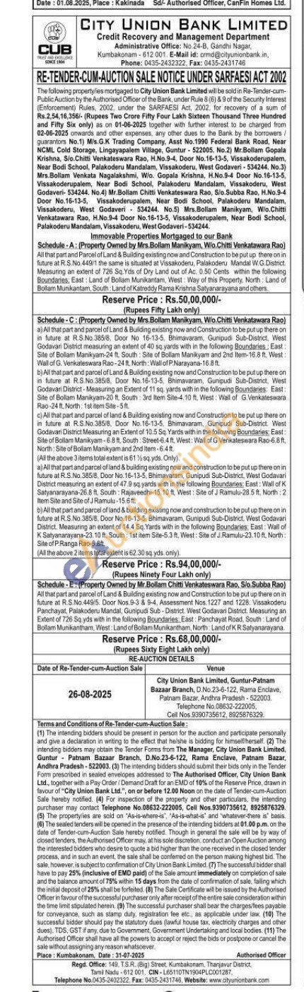 Schedule-E: (Property Owned by Mr. Bollam Chitti Venkateswara Rao, Sio. Subba Rao) All that part and parcel of Land & Building existing now and Construction to be put up there on in future at R.S.No.449/5. Door Nos.9-3 & 9-4, Assessment Nos. 1227 and 1228. Vissakoderu Panchayat, Palakoderu Mandal, Gunipudi Sub-District. West Godavari District. Measuring an Extent of 726 Sq yds with in the following Boundaries, East: Panchayat Road, South: Land of Bollam Munikantham, West: Land of Bollam Munikantham, North: Land of K R Satyanarayana