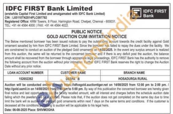 IDFC First Bank Ltd Gold Auctions Auction in Chennai