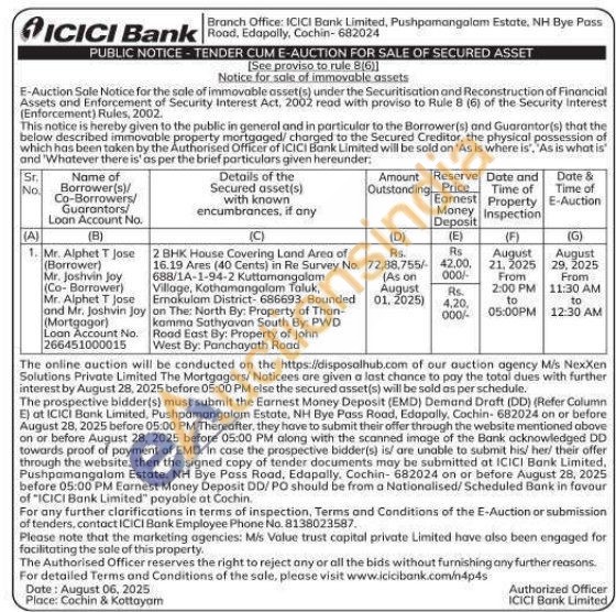2 BHK House Covering Land Area of 16.19 Ares (40 Cents) in Re Survey No. 688/1A-1-94-2 Kuttamangalam Village, Kothamangalam Taluk, Ernakulam District- 686693.