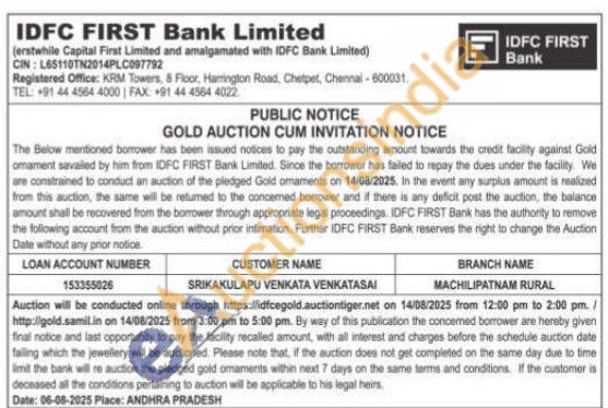 IDFC First Bank Ltd Gold Auctions Auction in Krishna