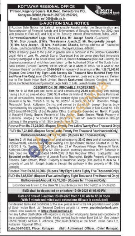 having a built up area of about 2900 Sq ft within the limits of Moonilavu Grama Panchayal and all constructions, improvements, easementary rights existing and appurtenant thereon situated in Sy No. 710/2/5 & Re. Sy. No. 382/6-1 in Block No. 53 of Moonilavu Village, Meenachil Taluk, Kottayam District and owned by (Late) Mr. Joseph Scaria, (now represented by his legal heirs), morefully described in 1 Schedule in Sale Deed No. 450/2002 dated 01-04-2002 of Sub Registrar Office Erattupelta Bounded on: North: Property of Kadariyil Family, South: Property of Siby Joseph, East: Stream, West: Property of Kulathinal George [The access to this property of Late Mr. Joseph Scaria is through pathway in the property of Mr. Siby Joseph (Item No.2)