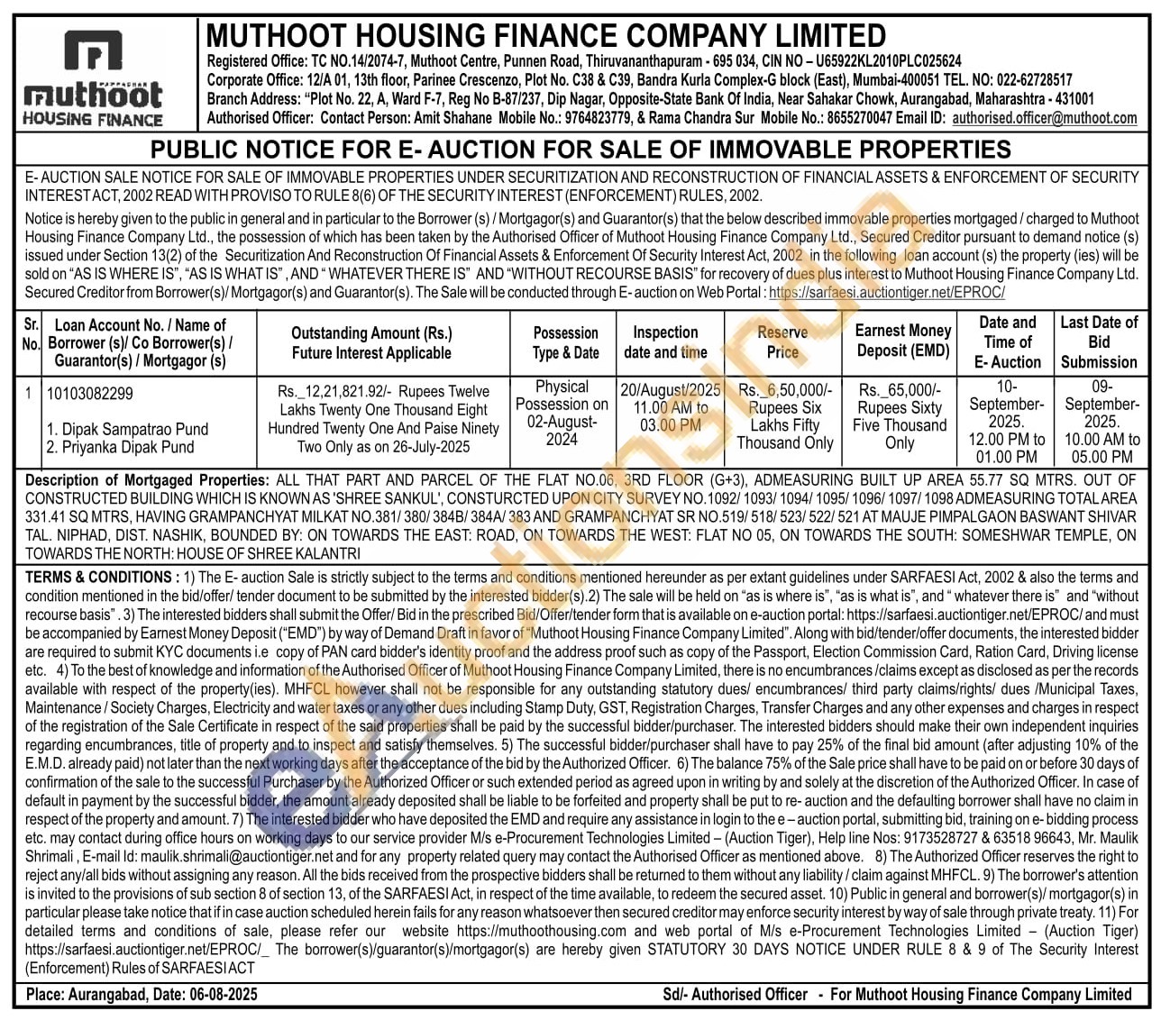 Description of Mortgaged Properties: ALL THAT PART AND PARCEL OF THE FLAT NO.06, 3RD FLOOR (G+3), ADMEASURING BUILT UP AREA 55.77 SQ MTRS. OUT OF CONSTRUCTED BUILDING WHICH IS KNOWN AS 'SHREE SANKUL', CONSTURCTED UPON CITY SURVEY NO.1092/1093/1094/1095/1096/1097/1098 ADMEASURING TOTAL AREA 331.41 SQ MTRS, HAVING GRAMPANCHYAT MILKAT NO.381/380/3848/384A/383 AND GRAMPANCHYAT SR NO.519/518/523/522/521 AT MAUJE PIMPALGAON BASWANT SHIVAR TAL. NIPHAD, DIST. NASHIK, BOUNDED BY: ON TOWARDS THE EAST: ROAD, ON TOWARDS THE WEST: FLAT NO 05, ON TOWARDS THE SOUTH: SOMESHWAR TEMPLE, ON TOWARDS THE NORTH: HOUSE OF SHREE KALANTRI