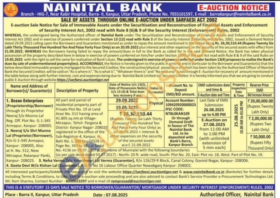 All part and parcel of residential property part of Private Plot No. 19 at Land Arazi No. 512 having area of 41.805 sq.mtr.at Village-Mirzapur, Tehsil- Pargana & District- Kanpur Nagar- 208020 registered in the office of the Sub-Registrar-4, Kanpur, in Bahi No. 1, Zild No. 10328 on Page No. 343 to 370 at Serial No. 4136 on 03.07.2017 in the name of Munnalal with the following boundaries (as per sale deed dated 03.07.2017): North: 20 ft. wide road, South: Plot No. 20, East: Plot no. 18, West: Part of Plot No. 19.