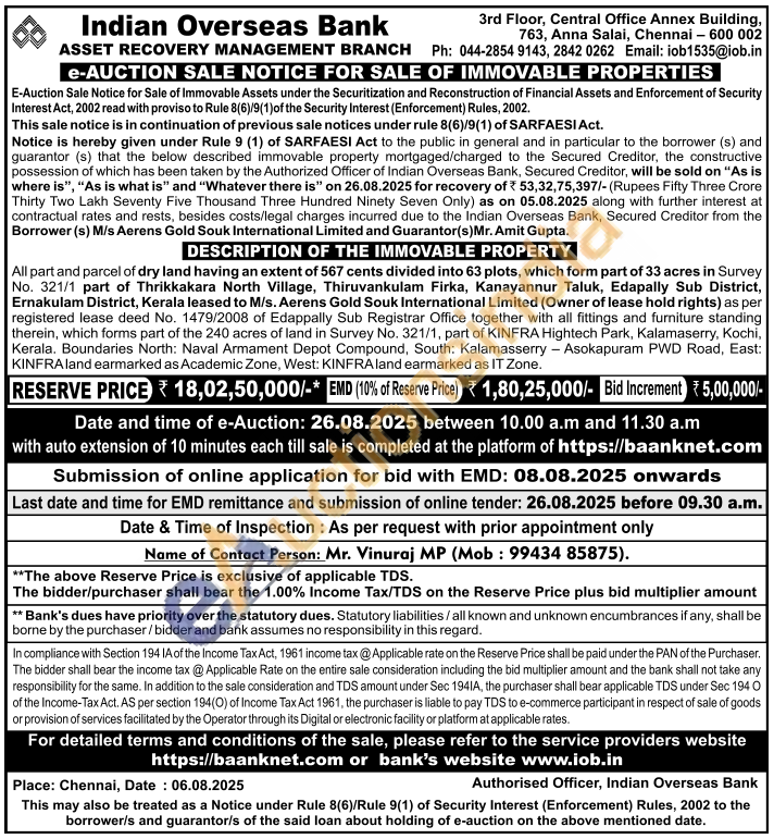 All part and parcel of dry land having an extent of 567 cents divided into 63 plots, which form part of 33 acres in Survey No. 321/1 part of Thrikkakara North Village, Thiruvankulam Firka, Kanayannur Taluk, Edapally Sub District, Ernakulam District, Kerala leased to M/s. Aerens Gold Souk International Limited (Owner of lease hold rights) as per registered lease deed No. 1479/2008 of Edappally Sub Registrar Office together with all fittings and furniture standing therein, which forms part of the 240 acres of land in Survey No. 321/1, part of KINFRA Hightech Park, Kalamaserry, Kochi, Kerala. Boundaries North: Naval Armament Depot Compound, South: Kalamasserry - Asokapuram PWD Road, East: KINFRA land earmarked as Academic Zone, West: KINFRA land earmarked as IT Zone.