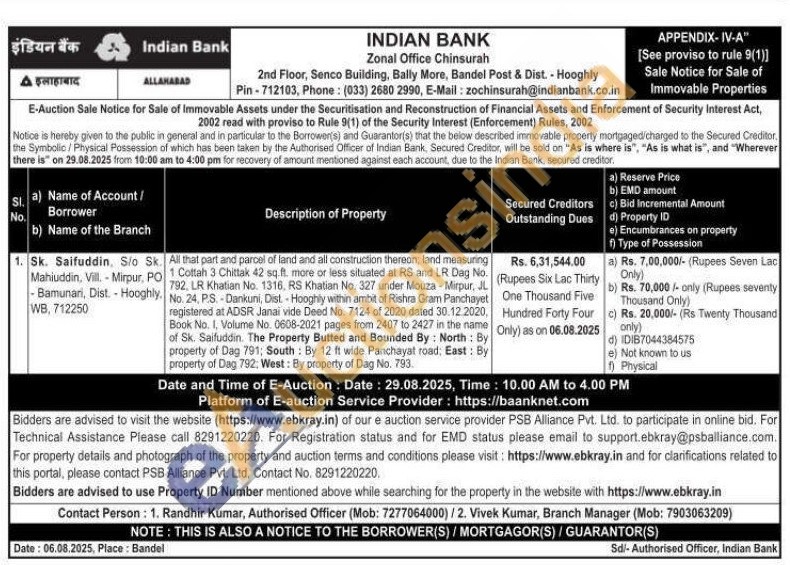 All that part and parcel of land and all construction thereon; land measuring 1 Cottah 3 Chittak 42 sq.ft. more or less situated at RS and LR Dag No. 792. LR Khatian No. 1316. RS Khatian No. 327 under Mouza-Mirpur, JL No. 24, P.S.-Dankuni, Dist.- Hooghly within ambit of Rishra Gram Panchayet registered at ADSR Janai vide Deed No. 7124 of 2020 dated 30.12.2020, Book No. I, Volume No. 0608-2021 pages from 2407 to 2427 in the name of Sk. Saifuddin. The Property Butted and Bounded By: North: By property of Dag 791; South: By 12 ft wide Panchayat road, East: By property of Dag 792: West: By property of Dag No. 793.