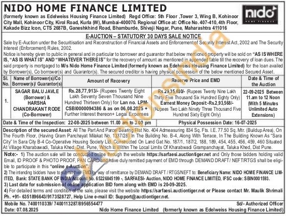 Description of the secured Asset All The Part And Parcel Bearing Flat No. 404 Admeasuring 834 Sq. Fts. LE. 77.50 Sq. Mtr. (Buildup Areaj. On The Fourth Floor, (Having Gram Panchayat Milakat No. 1337/28) In The Building No. B-4. Along With Terrace, In The Building Known As "Sara City In Sara City B-4. Co-Operative Housing Society Ltd. Constructed On Land Gat No. 187/1, 187/2, 188, 189, 454, 455, 456, 459, 460 Situated. At Village Kharabawadi, Taluka Khed. Dist. Pune, Which Is Within The Local Limits Of Kharabwadi Grampanchayat, Taluka Khed, Dist Pune