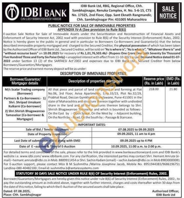 All that piece and parcel of land comprised in and forming at Flat No.06, 3rd Floor, Aviva Apartments, S.no.33/23, Plot No.32/29, Prabhat Road, Deccan Gymkhana, Erandawane, Pune-411001 in the state of Maharashtra and structure thereon together with undivided share in the land and all the structures thereon belongs to Shri. Shirish Bhagawanrao Tamasekar and which is bounded as follows:-On the East by Open Space, On the West by Adjacent building, On the North by: Road, On the South by:- Passage & Staircase.