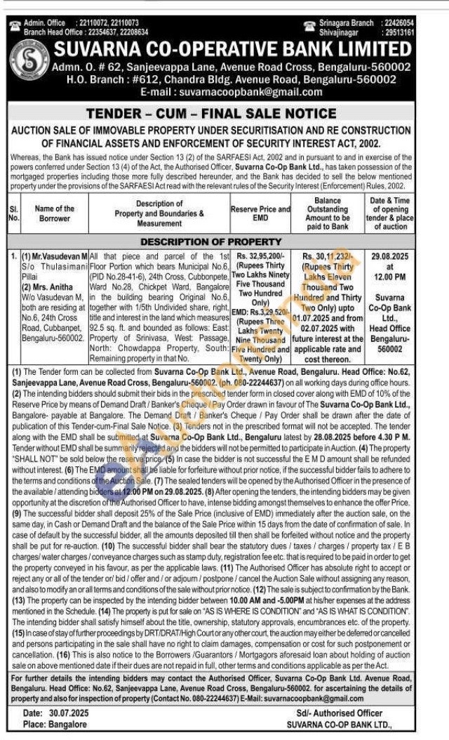 All that piece and parcel of the 1st Floor Portion which bears Municipal No.6 (PID No.28-41-6), 24th Cross, Cubbonpete. Ward No.28, Chickpet Ward, Bangalore in the building bearing Original No.6. together with 1/5th Undivided share, right. title and interest in the land which measures 92.5 sq. ft. and bounded as follows: East Property of Srinivasa, West Passage. North: Chowdappa Property, South: Remaining property in that No