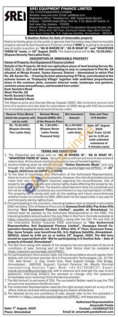 Details of the Property: All that non agriculture piece of land bearing Survey No. 322/1,322/2, 323 and 406 corresponding to and/or comprised in Plot No. 28 situated at Mouje Kundal, Taluka Sanand, District Ahmedabad in which Plot No. 28, Sector No.-4 having its total admeasuring 4778 sq. yard situated at the scheme known as "Pushparaj Village" together with undivided proportionate share in the common plots, common internal roads, landscape and gardens, common areas and pathways, and bounded here under: East: Society's Road West: Plot No 29 North: Society's Road South: Society's Road