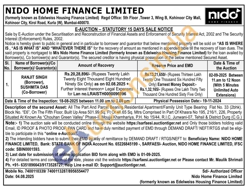 Description of the secured Asset: All The Part And Parcel Bearing Residential Apartment/Family Unit Type Bearing Flat No. 33 (2bhk). Block No. "E6", On The Fifth Floor, Built Up Area 501.99 Sq. Ft Or 46.65 Sq. Mtrs Comprised In Part Of Khasra No 195, 216/1, 226, Property Situated At Known As "Chouhan Green Valley" Phase-li, Mouja Khamhariya, P.H. No 15/44, R.I.C. Junwani-07, Tehsil & District Durg (C.G.)