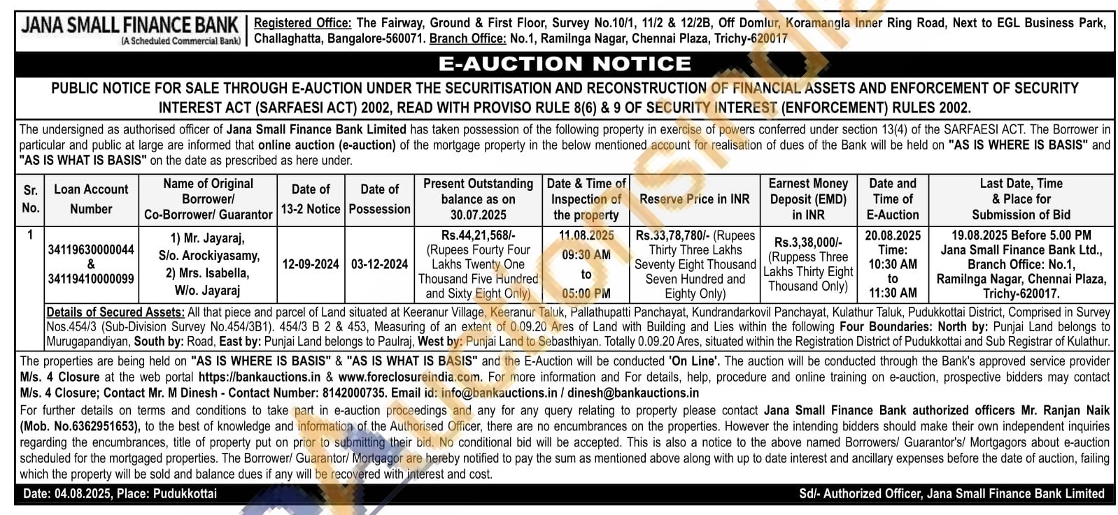 Details of Secured Assets: All that piece and parcel of Land situated at Keeranur Village, Keeranur Taluk, Pallathupatti Panchayat, Kundrandarkovil Panchayat, Kulathur Taluk, Pudukkottai District, Comprised in Survey Nos.454/3 (Sub-Division Survey No.454/3B1), 454/3 B 2 & 453, Measuring of an extent of 0.09.20 Ares of Land with Building and Lies within the following Four Boundaries: North by: Punjai Land belongs to Murugapandiyan, South by: Road, East by: Punjai Land belongs to Paulraj, West by: Punjai Land to Sebasthiyan. Totally 0.09.20 Ares, situated within the Registration District of Pudukkottai and Sub Registrar of Kulathur.