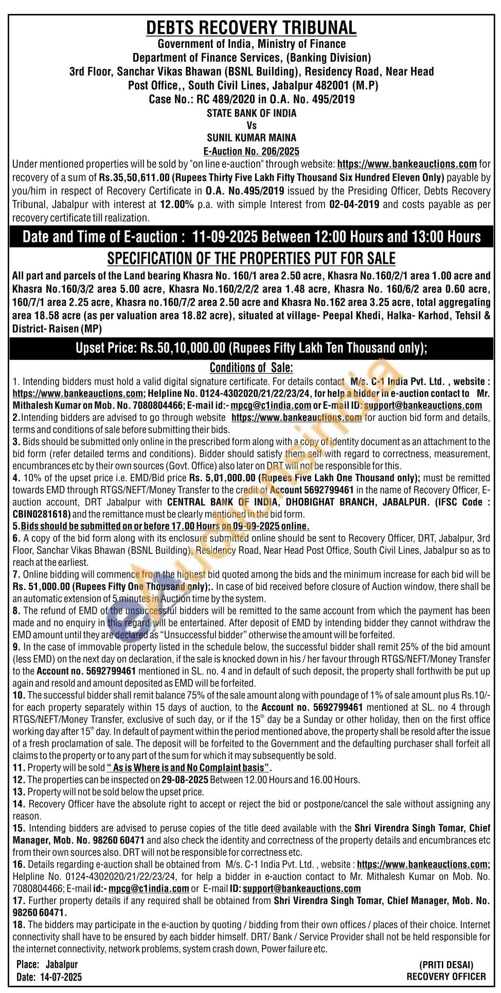 All part and parcels of the Land bearing Khasra No. 160/1 area 2.50 acre, Khasra No.160/2/1 area 1.00 acre and Khasra No.160/3/2 area 5.00 acre, Khasra No.160/2/2/2 area 1.48 acre, Khasra No. 160/6/2 area 0.60 acre, 160/7/1 area 2.25 acre, Khasra no. 160/7/2 area 2.50 acre and Khasra No. 162 area 3.25 acre, total aggregating area 18.58 acre (as per valuation area 18.82 acre), situated at village-Peepal Khedi, Halka-Karhod, Tehsil & District-Raisen (MP)