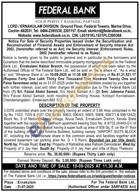 0.0376 undivided share over the property having an extent of 5.66 Ares comprised in Re Sy No. 110/3, 110/5 & 110/7 (Old Sy No. 506/3, 506/4/2, 506/5, 506/6, 506/7/1 & 506/12A/2) Block No. 9 of Nedumbassery Village, Aluva Taluk, Ernakulam District, Kerala State together with the residential 2 bedroom apartment bearing Door No. A 9/733 (9/440-G1) of Nedumbassey Grama Panchayat having a super built up area of 938 Sq. ft. on the 5th floor of the building of M/s Lord Krishna Builders, building namely "AIRPORT SUITS BLOCK III", including the proportionate share in the common areas and facilities together with covered basement car parking area No. G+ 5 floors. Bounded (as per title deed): North by: Private Road, East by: Property of Ratnabhai alias Ratnam Damodaran, West by: Property of V Jay Hari, South by: Property of V Jay Hari and Villa of Bijoy Thekkoot