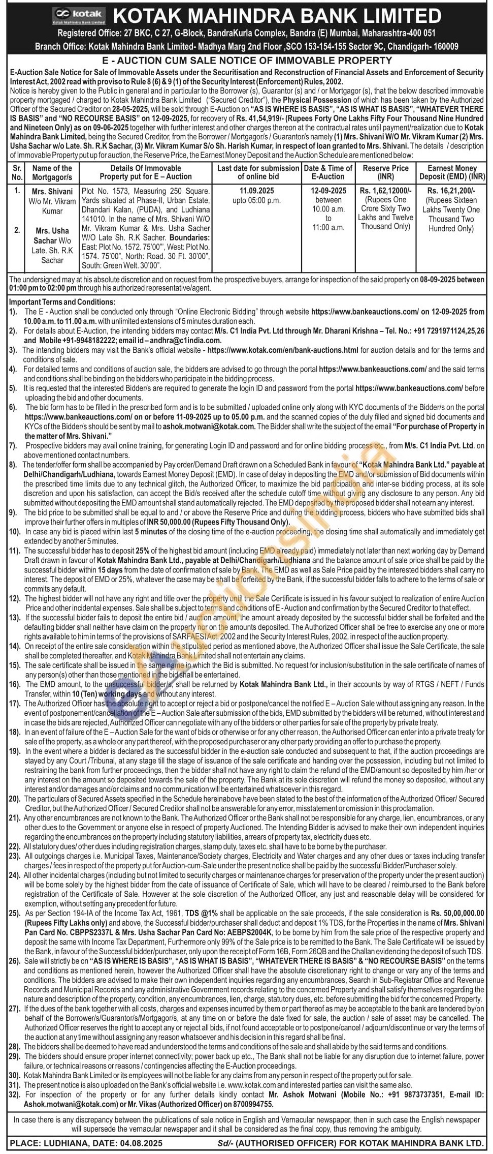 Plot No. 1573, Measuring 250 Square. Yards situated at Phase-II, Urban Estate, Dhandari Kalan, (PUDA), and Ludhiana 141010. In the name of Mrs. Shivani W/O Mr. Vikram Kumar & Mrs. Usha Sacher W/O Late Sh. R.K Sacher. Boundaries: East: Plot No. 1572. 75'00", West: Plot No. 1574. 75'00", North: Road. 30 Ft. 30'00", South: Green Welt. 30'00".v