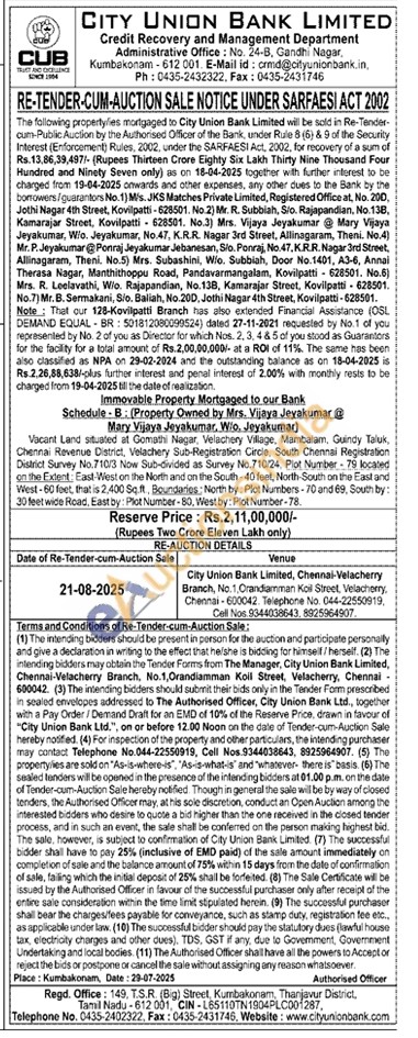 Vacant Land situated at Gomathi Nagar, Velachery Village, Mambalam, Guindy Taluk, Chennai Revenue District, Velachery Sub-Registration Circle, South Chennai Registration District Survey No.710/3 Now Sub-divided as Survey No.710/24, Plot Number-79 located on the Extent: East-West on the North and on the South- 40 feet, North-South on the East and West-60 feet, that is 2,400 Sq.ft, Boundaries: North by. Plot Numbers-70 and 69, South by: 30 feet wide Road. East by: Plot Number-80, West by: Plot Number-78.