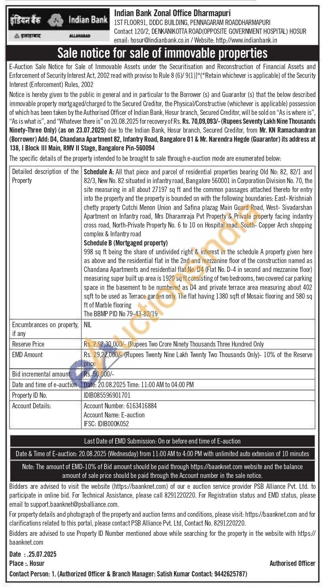 Schedule A: All that piece and parcel of residential properties bearing Old No: 82, 82/1 and 82/3, New No. 82 situated in infantry road, Bangalore 560001 in Corporation Division No. 70, the site measuring in all about 27197 sq ft and the common passages attached thereto for entry into the property and the property is bounded on with the following boundaries: East-Krishniah chetty property Cutchi Menon Union and Safina plazag Main Guard Road, West- Sivadarshan Apartment on Infantry road, Mrs Dharamraja Pvt Property & Private property facing indantry cross road, North-Private Property No. 6 to 10 on Hospital road, South- Copper Arch shopping complex & Infantry road Schedule B (Mortgaged property) 998 sq ft being the share of undivided right & interest in the schedule A property given here as above and the residential flat in the 2nd and mezzanine floor of the construction named as Chandana Apartments and residential flat No. D4 (Flat No. D-4 in second and mezzanine floor) measuring super built up area is 1920 sq ft consisting of two bedrooms, two covered car parking space in the basement to be numbered as D4 and private terrace area measuring about 402 sqft to be used as Terrace garden only. The flat having 1380 sqft of Mosaic flooring and 580 sq ft of Marble flooring The BBMP PID No 79-43-82/19