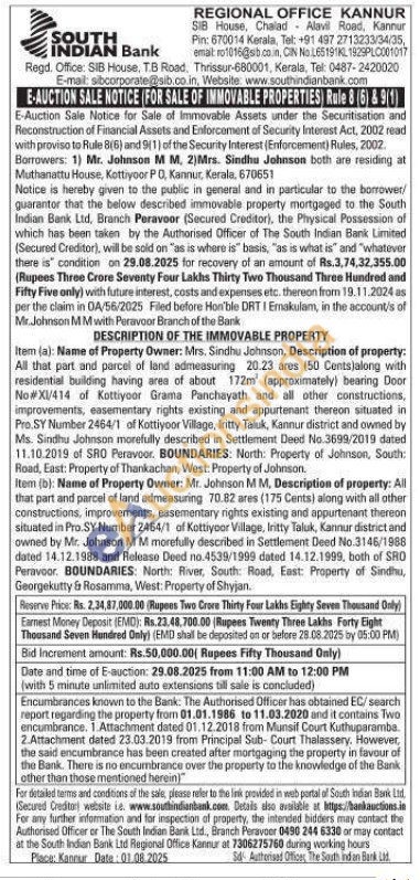 All that part and parcel of land admeasuring 20.23 ares 50 Cents along with residential building having area of about 172m approximately bearing Door No XI/414 of Kottiyoor Grama Panchayath and all other constructions, improvements, easementary rights existing and appurtenant thereon situated in Pro.SY Number 2464/1 of Kottiyoor Village, Iritty Taluk, Kannur district and owned by Ms. Sindhu Johnson morefully described in Settlement Deed No.3699/2019 dated 11.10.2019 of SRO Peravoor, BOUNDARIES: North: Property of Johnson, South: Road, East: Property of Thankachan, West: Property of Johnson.Item (b): Name of Property Owner: Mr. Johnson MM, Description of property: All that part and parcel of land admeasuring 70.82 ares (175 Cents) along with all other constructions, improvements, easementary rights existing and appurtenant thereon situated in Pro.SY Number 2464/1 of Kottiyoor Village, Iritty Taluk, Kannur district and owned by Mr. Johnson MM morefully described in Settlement Deed No.3146/1988 dated 14.12.1988 and Release Deed no.4539/1999 dated 14.12.1999, both of SRO Peravoor. BOUNDARIES: North: River, South: Road, East: Property of Sindhu, Georgekutty & Rosamma, West: Property of Shyjan.