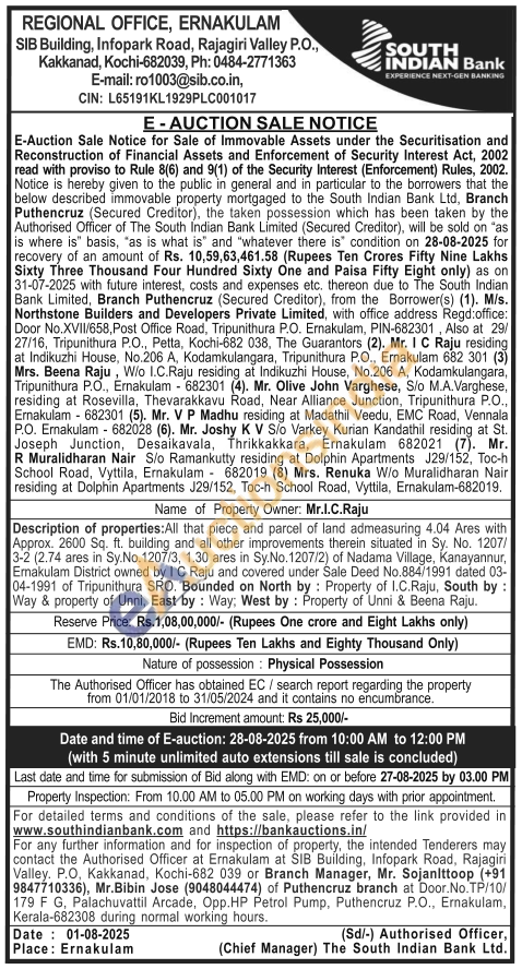 Description of properties: All that piece and parcel of land admeasuring 4.04 Ares with Approx. 2600 Sq. ft. building and all other improvements therein situated in Sy. No. 1207/3-2 (2.74 ares in Sy.No.1207/3, 1.30 ares in Sy.No.1207/2) of Nadama Village, Kanayannur, Emakulam District owned by I C Raju and covered under Sale Deed No.884/1991 dated 03-04-1991 of Tripunithura SRO. Bounded on North by Property of I.C.Raju, South by: Way & property of Unni, East by: Way; West by: Property of Unni & Beena Raju.