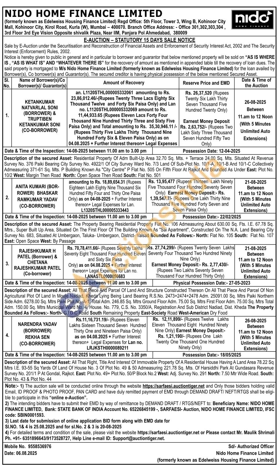 4)All That Right, Title And Interest Of Immovable Property Of A Residential House Having A Land Area 78.22 Sq Mtrs I.E. 93-55 Sq Yards Of Land Of House No. 3 Of Plot No. 49 & 50 Admeasuring 221.78 Sq. Mts. Of Harsiddhi Park At Gundasara Revenue Survey No. 201/1 P At Gondal, Rajkot. East: Plot No. 49+ Plot No. 50/P Block No.2 West: Adj. Survey No. 291 North: 7.50 Mtr Wide Road. South: Plot No. 43 & Plot No. 44