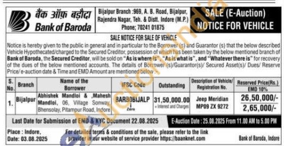 Bank of Baroda Vehicle Auction in Rajendra Nagar, Indore, Indore